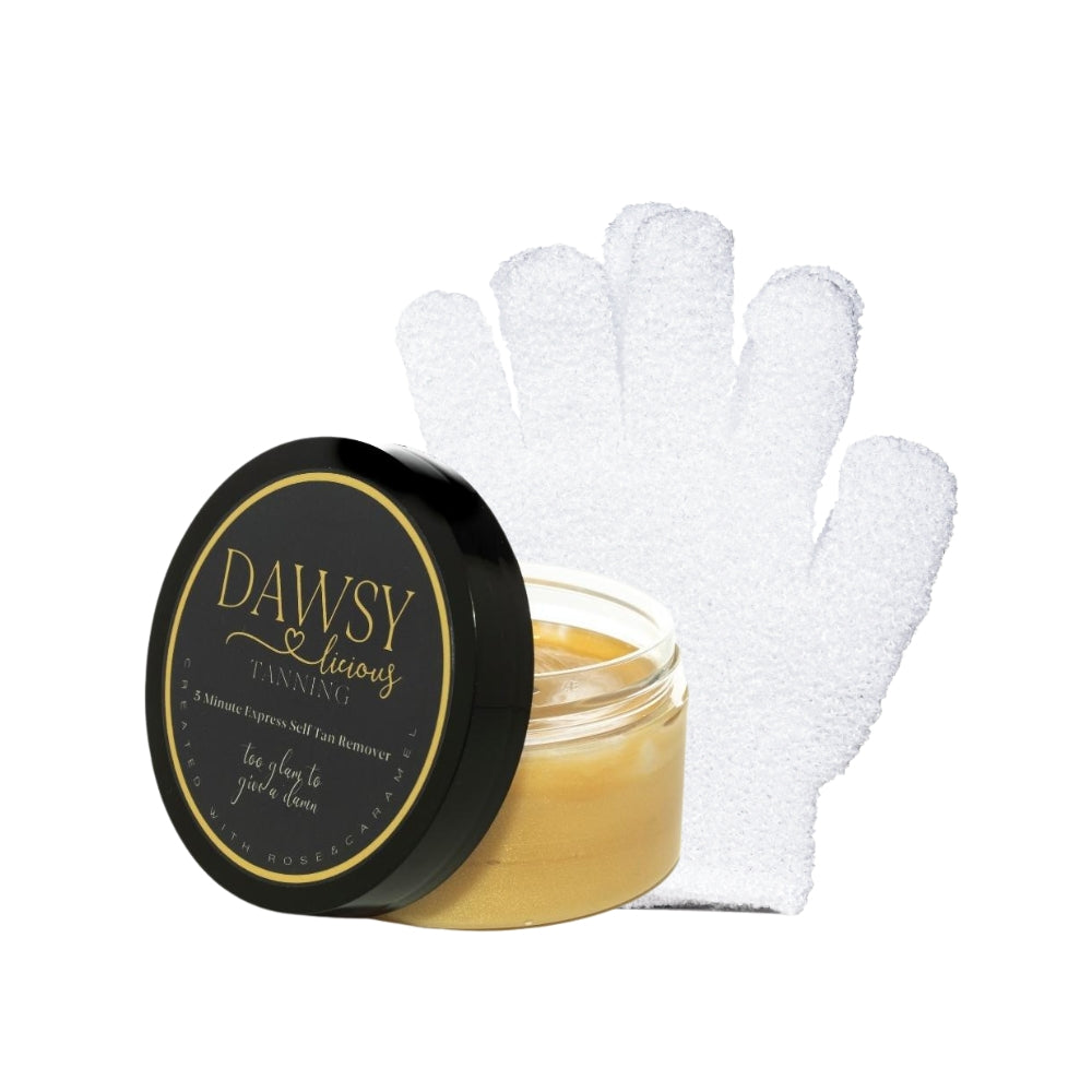 Let us introduce you to our express 3-minute self tan remover. Say goodbye to harsh scrubbing with this deluxe gold shimmering formula, infused with our signature Dawsylicious scent, comes with an exfoliating mitt for the ultimate exfoliation & removal.